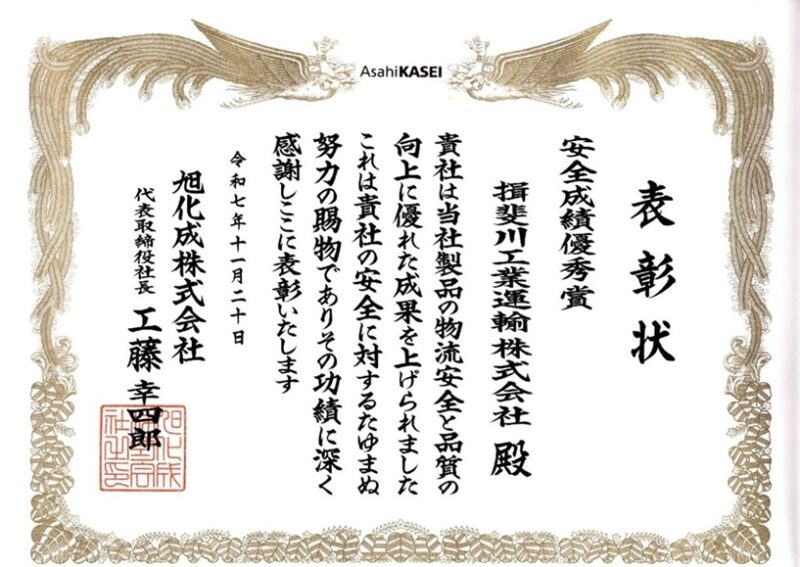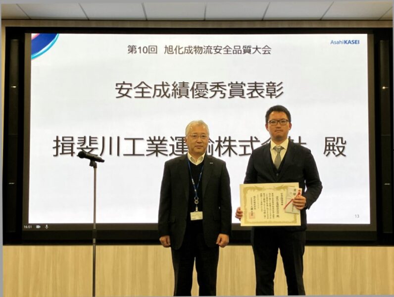大会では、旭化成製品の物流における安全および品質の向上に優れた成果を挙げた企業が「安全成績優秀賞」として表彰され、当社は全国から選ばれた4社のうちの1社として受賞しました。